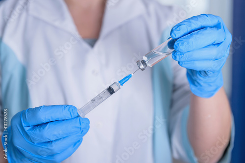 Doctor, nurse, scientist hand in blue gloves holding flu, measles, coronavirus, covid-19 vaccine disease preparing for child, baby, adult, man and woman vaccination shot, medicine and drug concept