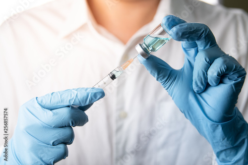 Doctor, nurse, scientist, man or women holding flu, hpv, rabies, mumps, measles, polio, or diphtheria vaccine bottle with syringe with needle prepare for immunization in baby, child or adult patient