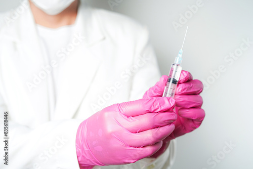doctor or scientist holding a syringe in pink gloves