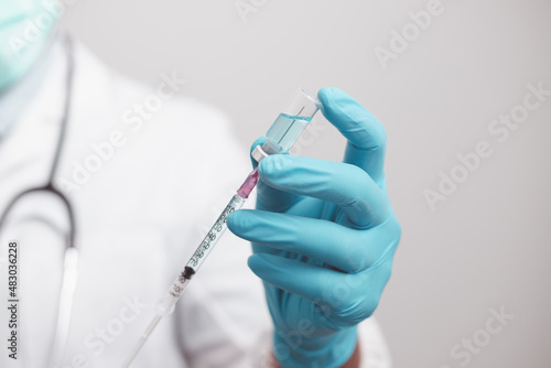 doctor or scientist in the COVID-19 medical vaccine research and development laboratory holds a syringe with a liquid vaccine to study and analyze antibody samples for the patient.