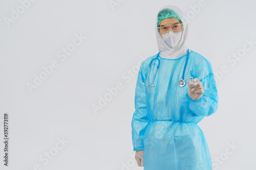 doctor PPE uniform holding coronavirus covid-19 vaccine bottle on hand