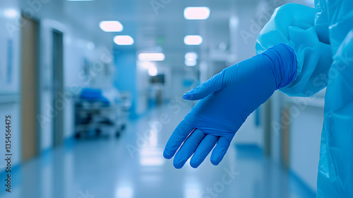 doctor putting on blue latex gloves in hospital, healthcare, occupational safety day, health day