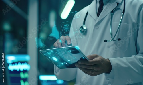 Doctor standing working with futuristic medical digital technology tablet with overlay in the air as medical science industry healthcare WHO concept