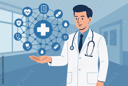 Doctor with Stethoscope Holding Medical Cross Icon, Healthcare Network Connection, Modern Hospital Background, Digital Health Innovation, Medicine Technology, Virtual Interface Concept
