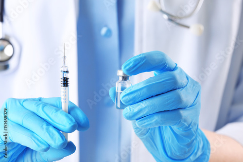 Doctor with syringe and medicine, closeup