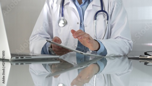Doctor woman, wearing a blue blouse under a medical coat, is using digital tablet in modern healthcare setting, interacting with patient data, close-up. Medicine concept