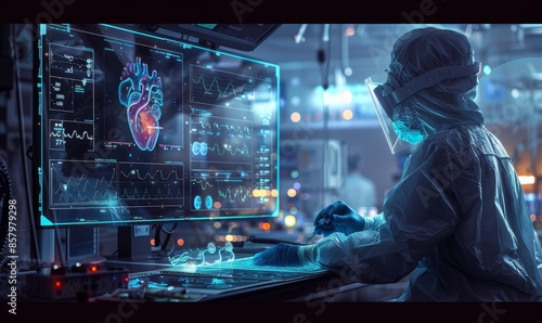 doctor working in futuristic hospital with medical high tech healthcare, surgeon team operation on heart disease and illness on monitor