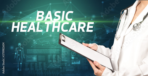 doctor writes notes on the clipboard with BASIC HEALTHCARE inscription, medical diagnosis concept