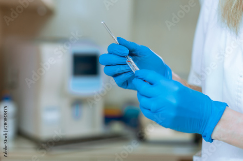 doctor's hand in rubber blue glove holding transparent syringe with closed cap