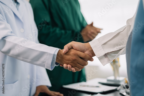 Doctors holding hands together at hospital.