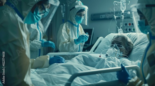 Doctors, paramedics in hospital coveralls and face mask save life of elderly female patient with Oxygen mask, drip, and heart rate sensor in Coronavirus emergency department