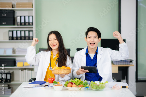 Doctors sharing fresh vegetables, promoting health and nutrition. Ideal for wellness, healthcare, and science themes.