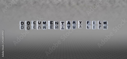 documentary film word or concept represented by black and white letter cubes on a grey horizon background stretching to infinity