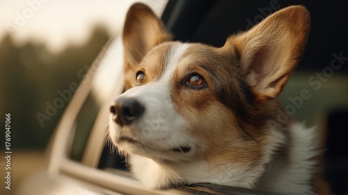 Dog Basking in Warm Sunset Glow While Resting Its Head on Car Window Frame, Capturing a Serene Moment During Golden Hour