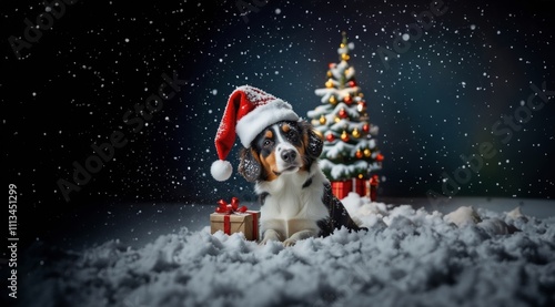 Dog in Santa hat on Night Christmas Background. Dog puppy in red Santa hat with Christmas gift on winter snow greeting card. Puppy dog in Christmas Santa hat near Christmas tree.