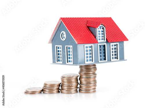 Dollar coin and small house model on white background