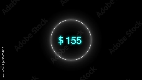 Dollar icon neon bright from $155 cyan color illustration. Black background circle cyan color frem 4k illustration.