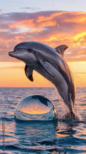 Dolphin jumping from ocean with sunset glow in background