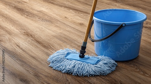 Domestic Mop Cleaning Action on Wooden Floor with Bucket and Brush to Remove Dirt and Dust