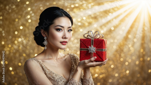 Donna di origini asiatiche ad una festa con un vestito elegante e un pacchetto regalo rosso nelle mani su uno sfondo color oro