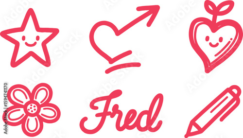 Doodle Delight: A Collection of Cute Pink Icons Featuring a Star, Heart, Flower, Pen, and Playful Typography, perfect for design projects