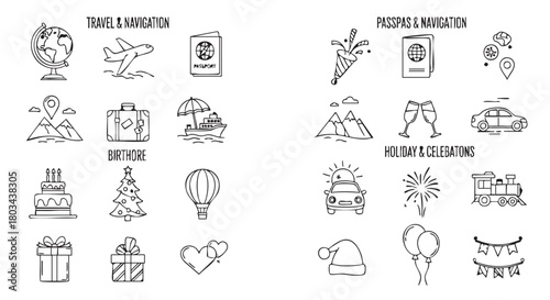 Doodle Icon Set for Travel Navigation Birthdays Christmas and Celebrations