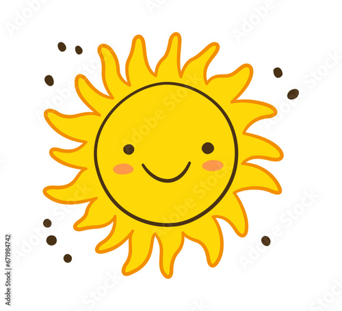Doodle sun icon. Hand drawn smile yellow sun with rays symbol. Doodle children drawing. Hand drawn star character. Hot weather sign. Vector illustration isolated on white background.