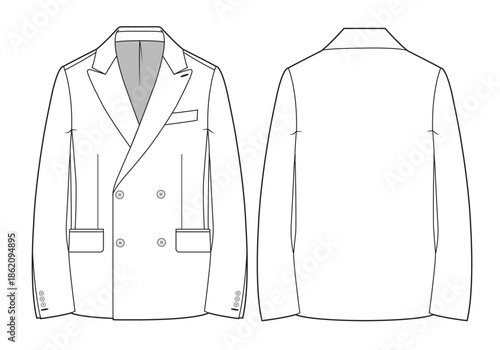 Double breasted blazer design technical flat sketch vector mockup template.