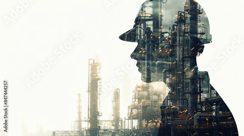 Double exposure concept of the oil and gas industry with an engineer's head profile wearing a helmet in front of an industrial plant against a white background