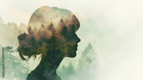 Double exposure of a girl profile portrait with misty landscape and fir forest in retro style. Copy space.