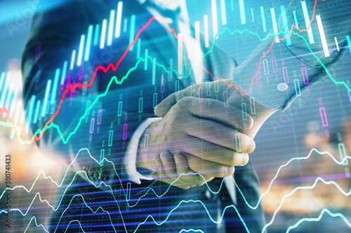 Double exposure of financial chart on cityscape background with two businessmen handshake. Concept of financial analysis and investment opportunities