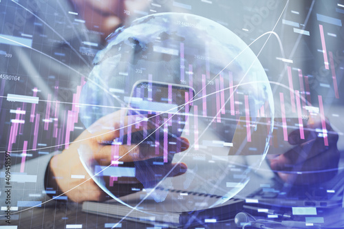 Double exposure of man's hands holding and using a phone and financial graph drawing. Analysis concept.
