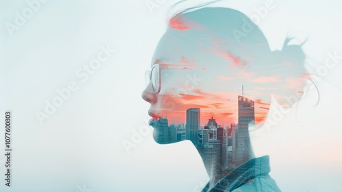 Double exposure of woman and city skyline, sunset hues, futuristic technology, urban innovation, career focus, modern abstract art, ambition theme