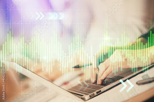 Double exposure of woman hands typing on computer and forex chart hologram drawing. Stock market invest concept.