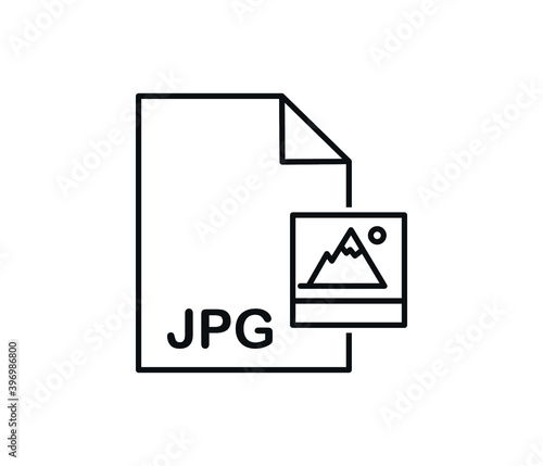 Download the JPG icon. The file is labeled JPG and the arrow sign is down. JPEG document type. Downloading document concept. Flat design vector icon