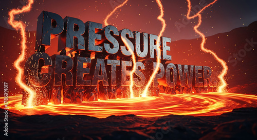 Dramatic 3D typography "Pressure Creates Power" emerges from molten lava surrounded by fiery energy and crackling sparks, embodying resilience and transformation.