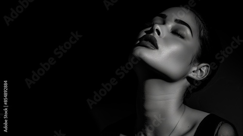 dramatic black and white portrait of young woman with head tilted back and eyes closed in deep thought against dark background copy space