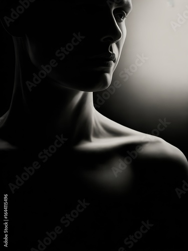 Dramatic close-up of a man's neck and shoulder in shadow