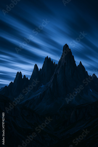 Dramatic dark blue mountains with streaking clouds evoke mystery and adventure