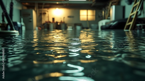 Dramatic flooded basement scene with deep water and storage damage—ideal for illustrating home insurance, climate risk, or emergency response