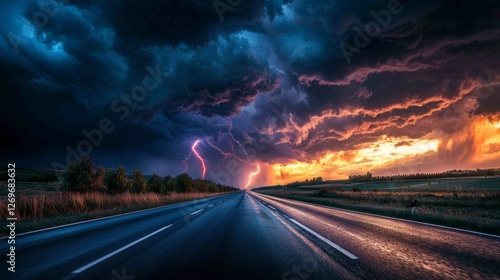 Dramatic Lightning Storm Over Asphalt Highway at Sunset