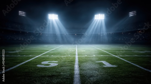 Dramatic Night View Of An Empty Stadium, Showcasing Iconic 50Yard Line From Unique Field level Perspective Large Green Field, With Its Detailed Yard Lines, Stretches Under Powerful Lights