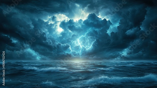 Dramatic ocean scene with turbulent waves and electrifying storm clouds illuminated by lightning and a fading light on the horizon.