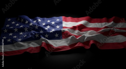 Dramatic rendering of a rippling United States flag against a stark black background
