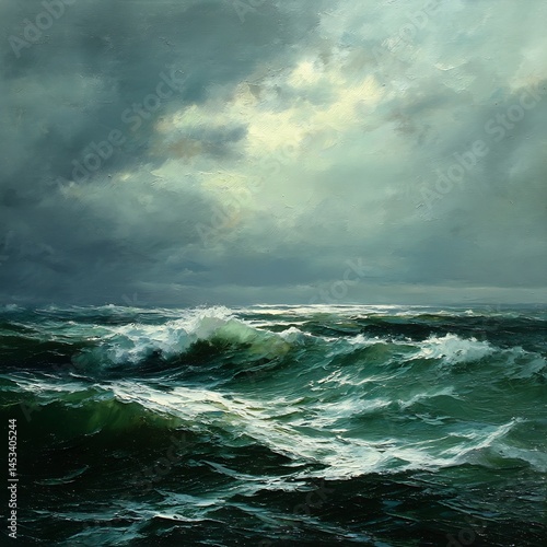 Dramatic seascape painting showcasing turbulent ocean under a stormy sky condition