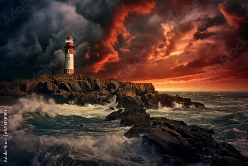 Dramatic sky background with storm clouds and a lighthouse on the coast