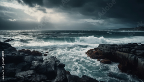 Dramatic sky breaks over wet coastline, danger in nature beauty generated by AI