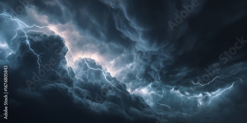 Dramatic storm clouds with bright lightning strikes fill the sky during twilight. Concept for climate change visualization, weather phenomenon, and ominous natural disaster depiction