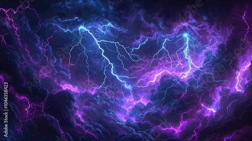 Dramatic stormy clouds with vibrant lightning in purple and blue hues.
