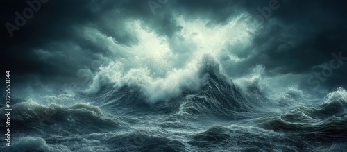 Dramatic stormy seascape with large waves crashing under a dark, stormy sky.